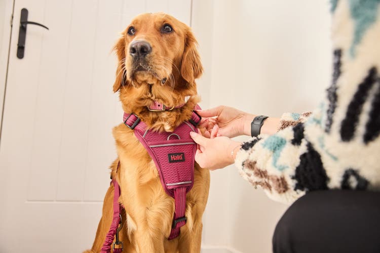 - If you've chosen simplicity over style, then you may be able to slip the harness directly over your dog's head, like with this Halti® No Pull Dog Harness. Once on, adjust the straps to sit under your dog's front armpits, tighten the straps, and you're good to go!